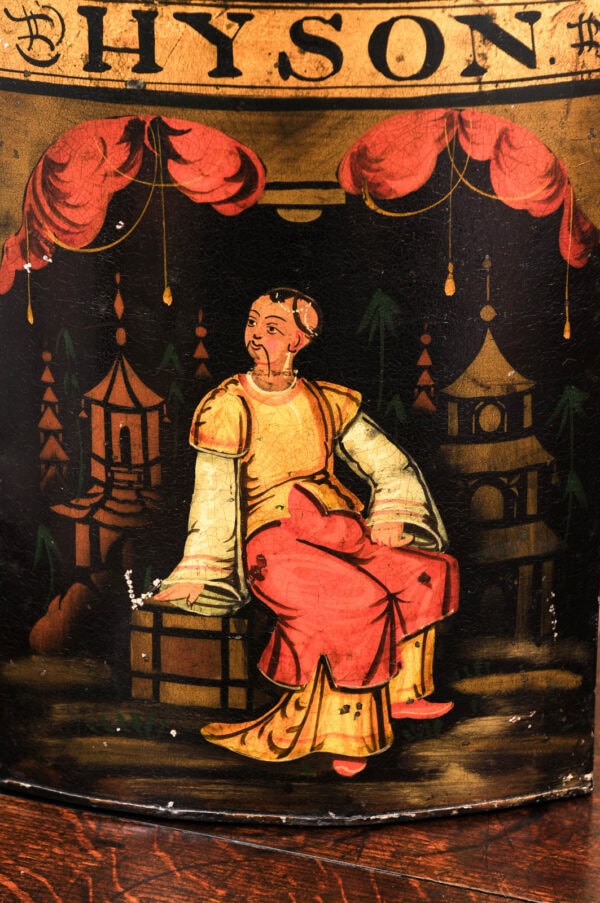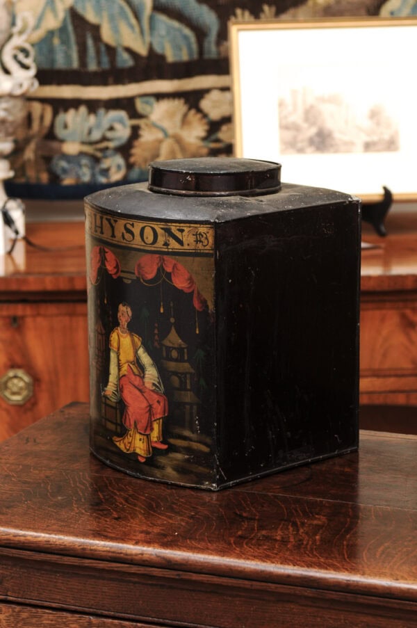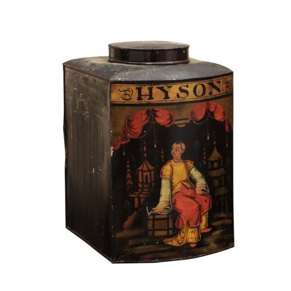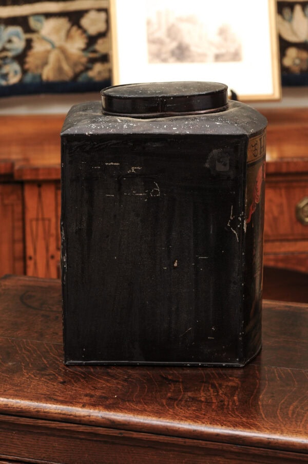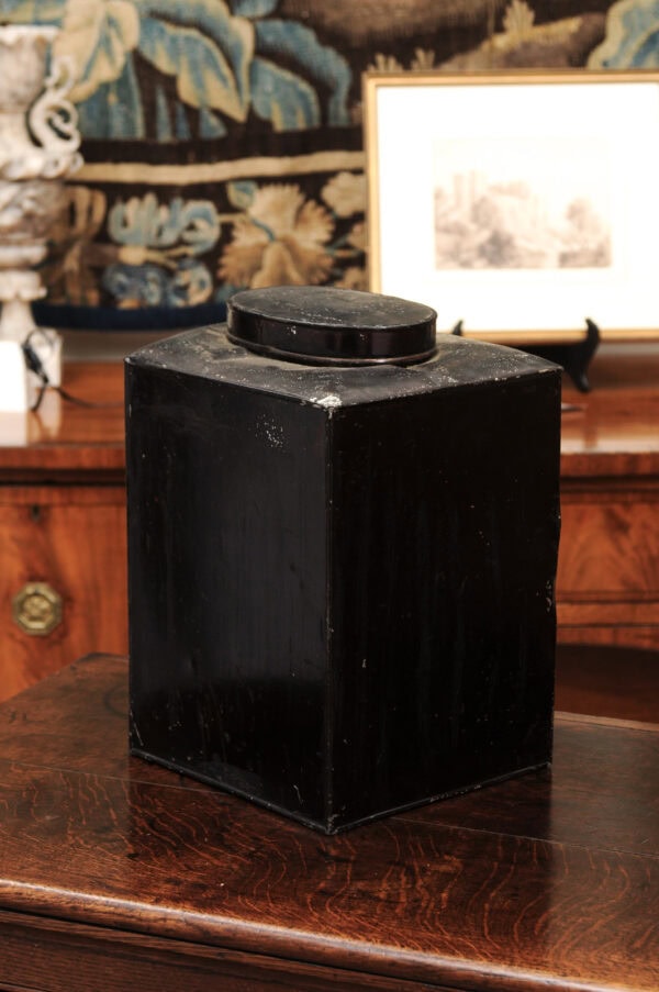 19th Century Square Form Chinoiserie Black Tole Tea Canister with Figure