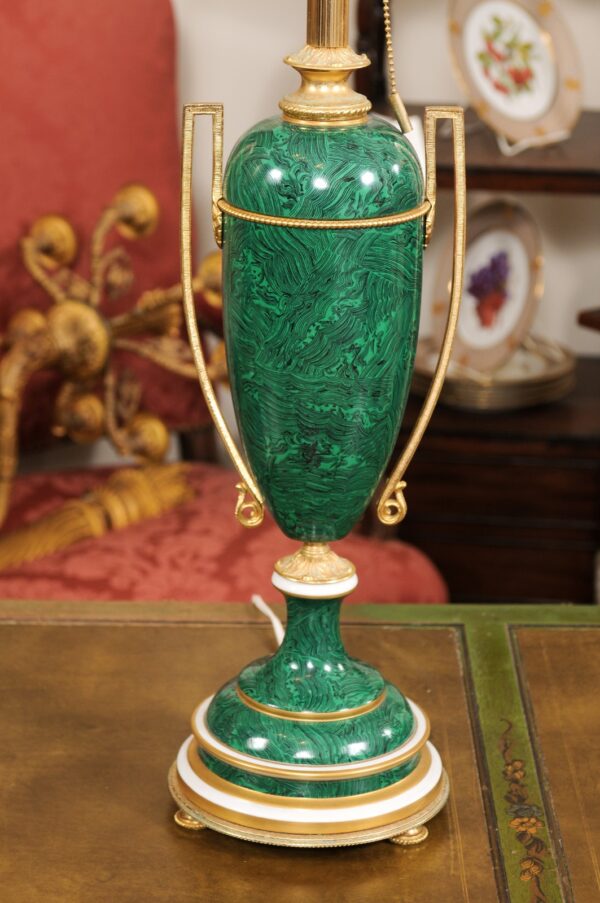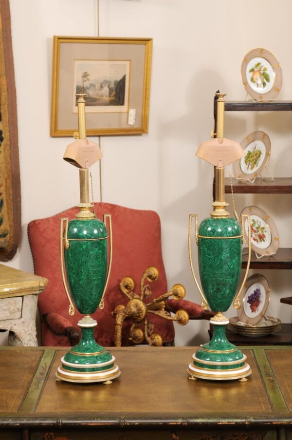 Pair of Faux Malachite Painted Urn-Shaped Lamps with Gilt Metal Mounts